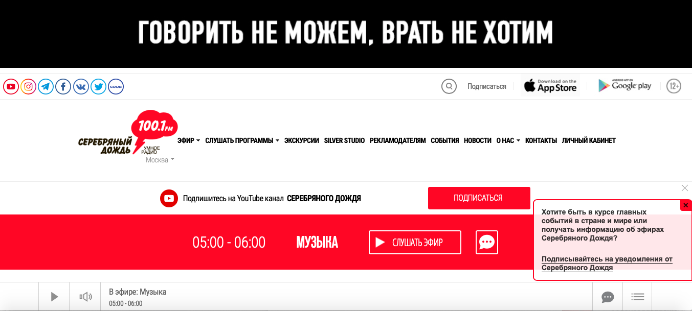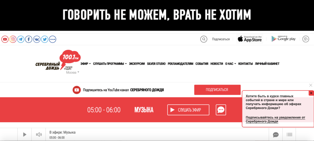 Echo of Moscow radio continues to speak out on YouTube, running the banner “We’re Still Working.” Silver Rain radio, home to detailed news and analysis in recent days, has tried to speak around the censors as best it can, using the “Aesopian language” of Soviet times to say what cannot be said. But they realize their avenues to truth are narrowing quickly and have turned to music programming on their streaming site beneath a banner reading “We cannot speak. We don’t want to lie.”